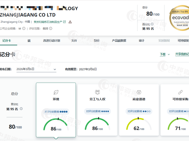 恭贺XX生物化工科技(张家港)有限公司2026年3月EcoVadis取得80分的优秀成绩